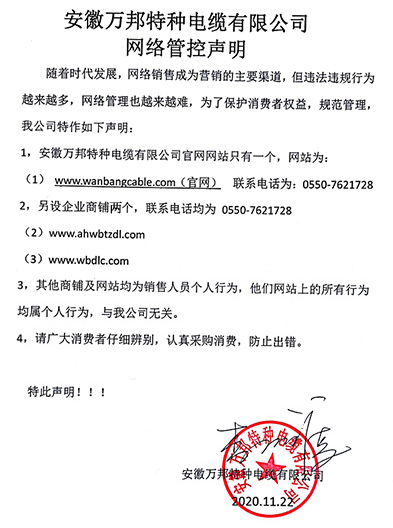 鄭重聲明:安徽萬邦特種電纜有限公司官方網站為:www_wanbangcable_com.19maoah.cn,除此之外無任何子網站或合作網站,其余均為假冒偽劣。電話:0550-7621728 13485756353 地 址:安徽省天長市滁州高新技術產業開發區經四路29號